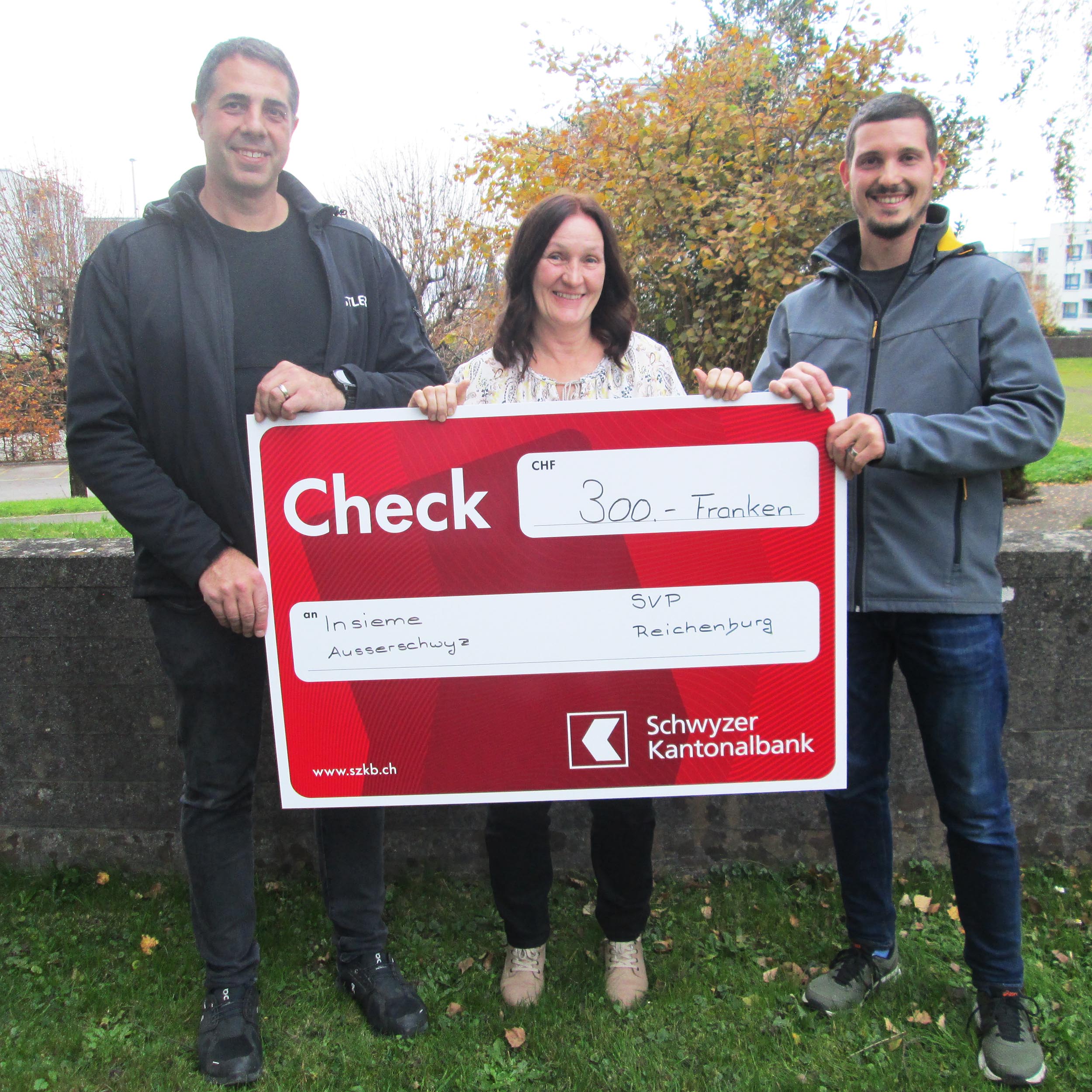 Mit einem «Hau den Lukas» half die Ortspartei der Schweizerischen Volkspartei SVP Reichenburg anlässlich der vergangenen Kantons-Chilbi mit, die beliebte und gutbesuchte Dorfchilbi um eine Attraktion reicher zu machen. Pro Schlag auf den «Hau den Lukas» wurden 1 Franken eingenommen. Nebst einer hohen Punktzahl und Spass gab es für die Teilnehmer als Belohnung einen Apfel oder ein Rüebli. Der Reinerlös – aufgerundet durch die Partei – von 300 Franken geht vollumfänglich an Insieme Ausserschwyz. Dieser Betrag wird für Freizeit-Angebote für Menschen mit einer geistigen Beeinträchtigung oder einer Lernschwäche eingesetzt. Der Präsident, Dominik Mettler und sein Vize, Ueli Kistler der SVP Reichenburg haben kürzlich den Reinerlös der Geschäftsstelle in Pfäffikon übergeben.
